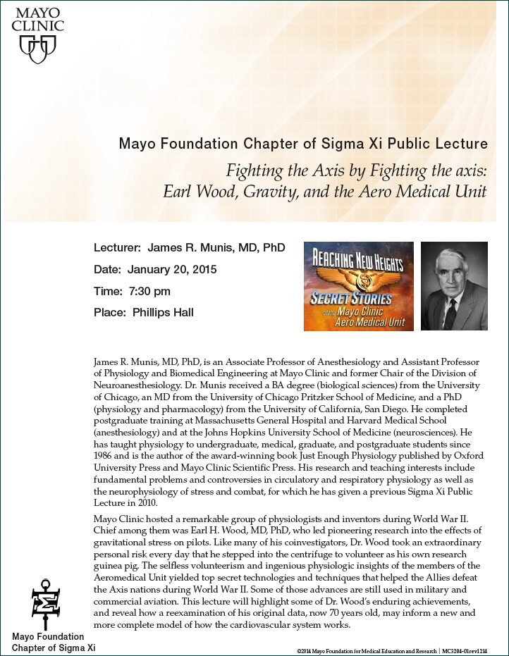 James R. Munis, MD, PhD, is an Associate Professor of Anesthesiology and Assistant Professor of Physiology and Biomedical Engineering at Mayo Clinic and former Chair of the Division of Neuroanesthesiology will talk about.Earl Wood, Gravity, and the Aero Medical Unit.